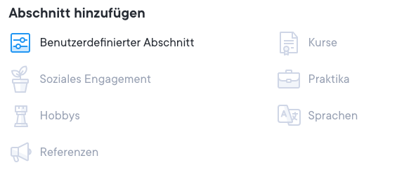Eine weitere Möglichkeit, deinen Lebenslauf individuell zu gestalten, sind die anpassbaren Abschnitte. Für jeden anpassbaren Abschnitt kannst du eine beliebige Überschrift auswählen. Um einen anpassbaren Abschnitt hinzuzufügen, scrolle im Lebenslauf-Editor nach unten und wähle dort aus den unterschiedlichen Optionen aus.
