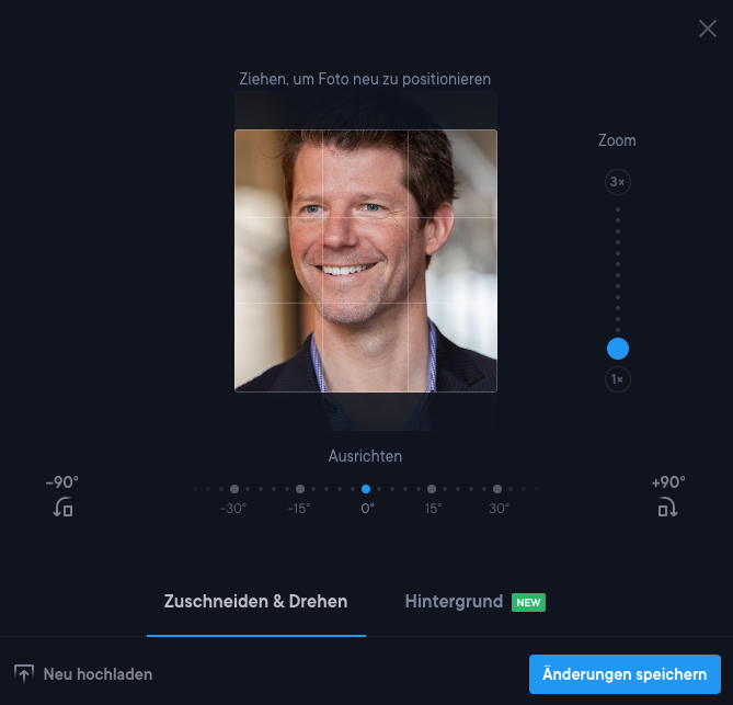 Das ideale Foto im Lebenslauf ist ein viereckiges Portrait mit einem 1:1 Verhältnis und mindestens 600 × 600 Pixeln. Nachdem dein Foto hochgeladen wurde, stehen dir erneut einige Optionen zur Bearbeitung zur Verfügung. Siehe Screenshot unten.