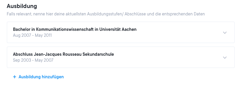 Unten im Editor gibt es einige optionale Abschnitte, wie Kurse, Referenzen, Sprache, Freizeitaktivitäten und Praktika.