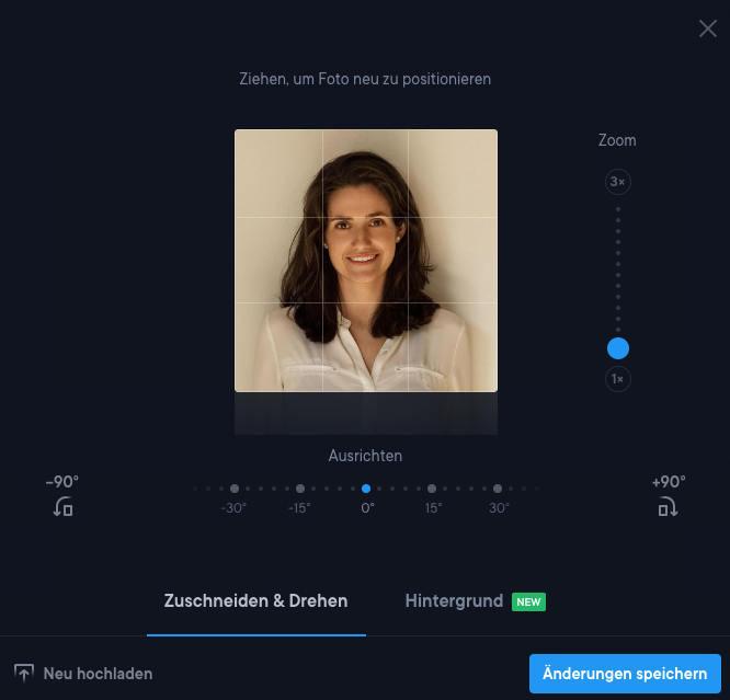 Foto: Wenn du ein professionelles Foto hast, dann lade es auch in diesem Abschnitt hoch. Beachte, dass einige der Vorlagen für Fotos vorgesehen sind und andere nicht.