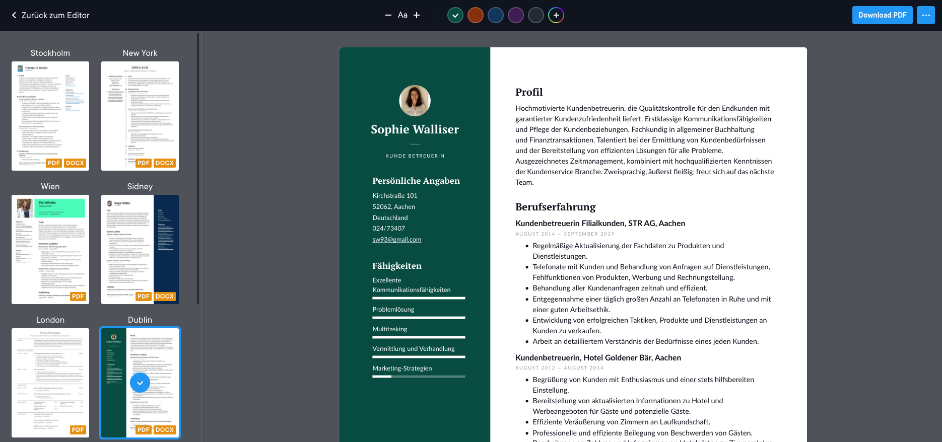 kannst du das Design ganz leicht ändern oder die einzelnen Abschnitte neu ordnen. Unser neues, individuell anpassbares Farbauswahl-Tool bietet eine große Auswahl an Farben in einem stufenweisen Farbauswahlsystem. Es war noch nie so einfach, einen erstklassigen und ganz individuellen Lebenslauf zu erstellen!
