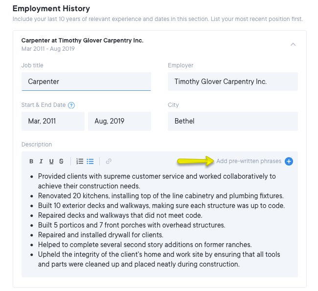Wenn du Details zu deinem beruflichen Werdegang hinzufügst, siehst du jetzt eine Schaltfläche mit „vorformulierte Sätze hinzufügen“. Einfach daraufklicken, nach einem spezifischen Job suchen und unser Lebenslauf-Editor wird dir dabei helfen, die besten Sätze hinzuzufügen. Es ist schnell, einfach und äußerst hilfreich!