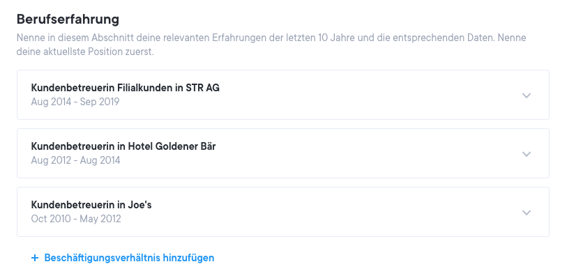 Dies ist der Hauptteil deines Lebenslaufs. Hier solltest du Positionen aufführen, die dir in den letzten 10 Jahren einschlägige Erfahrungen eingebracht haben. Im Folgenden findest du einen hilfreichen Artikel, welche frühere Positionen du in deinem Lebenslauf anführen solltest und welche nicht.