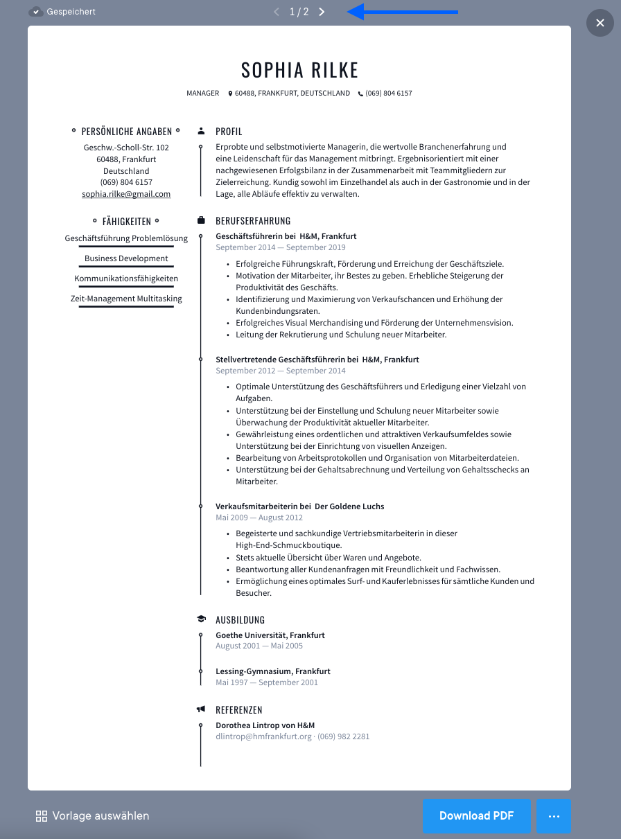 In der Vorschau deines Lebenslaufs oder Bewerbungsschreibens siehst du oben Pfeile, mit denen du auf die nächste Seite kommst. Siehe Screenshot unten.