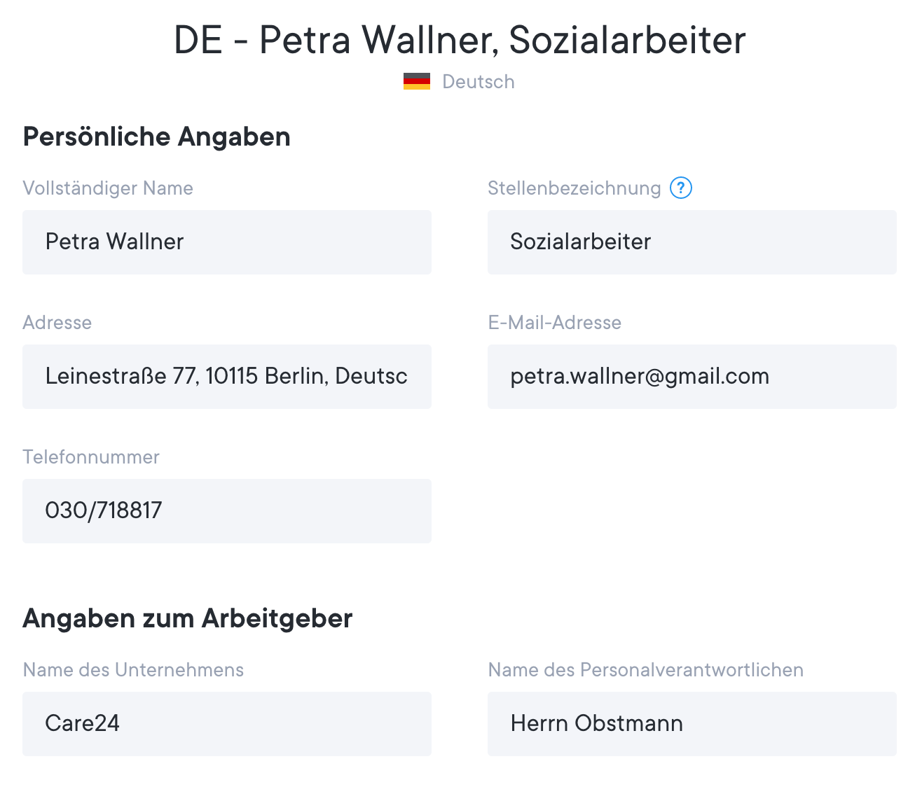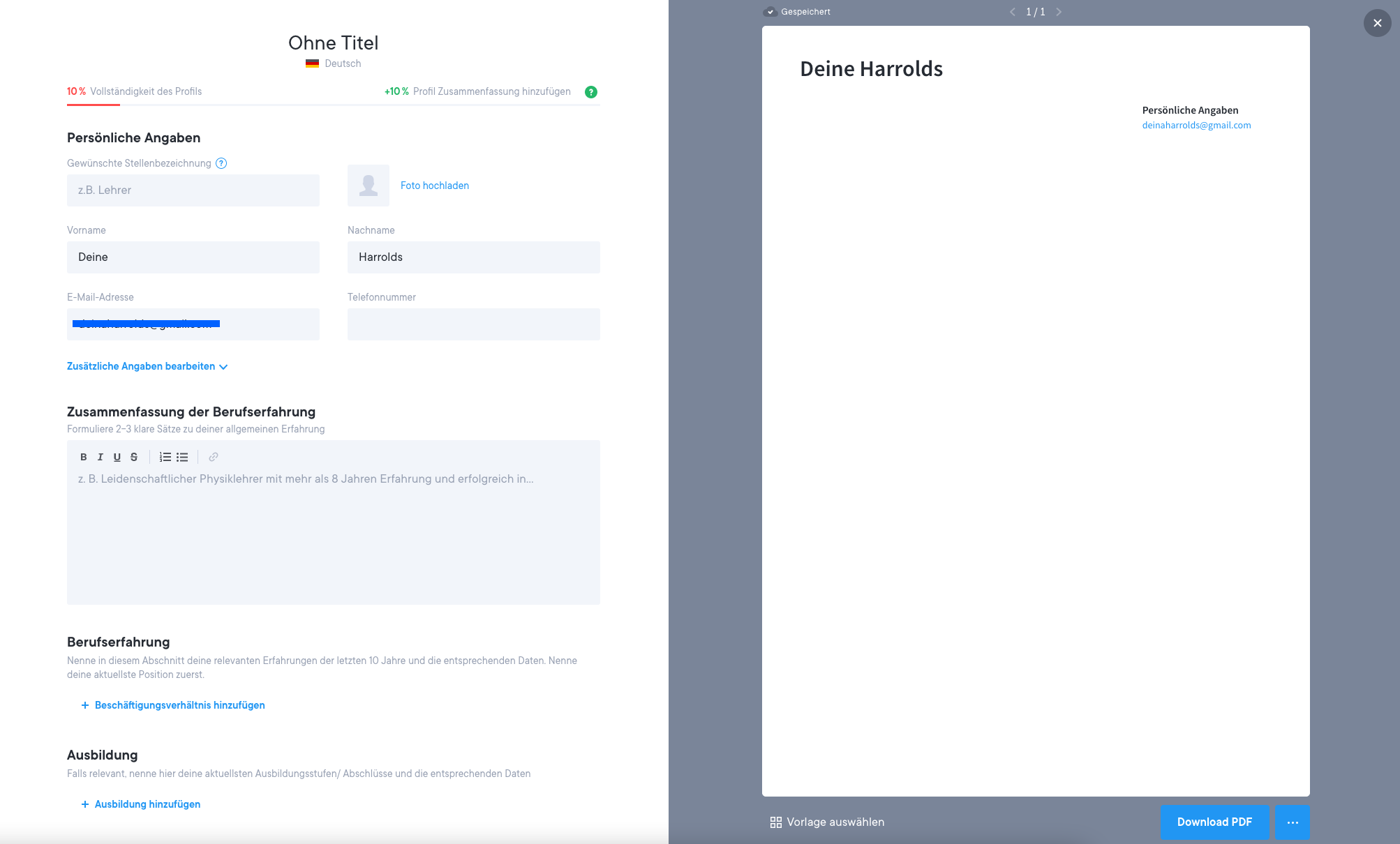 Der Abschnitt mit deinen persönlichen Angaben. Hier fügst du persönliche Informationen hinzu, einschließlich der Stellenbezeichnung. Wir machen für dich den Anfang und fügen bereits einige Details aus deinem Lebenslauf ein.