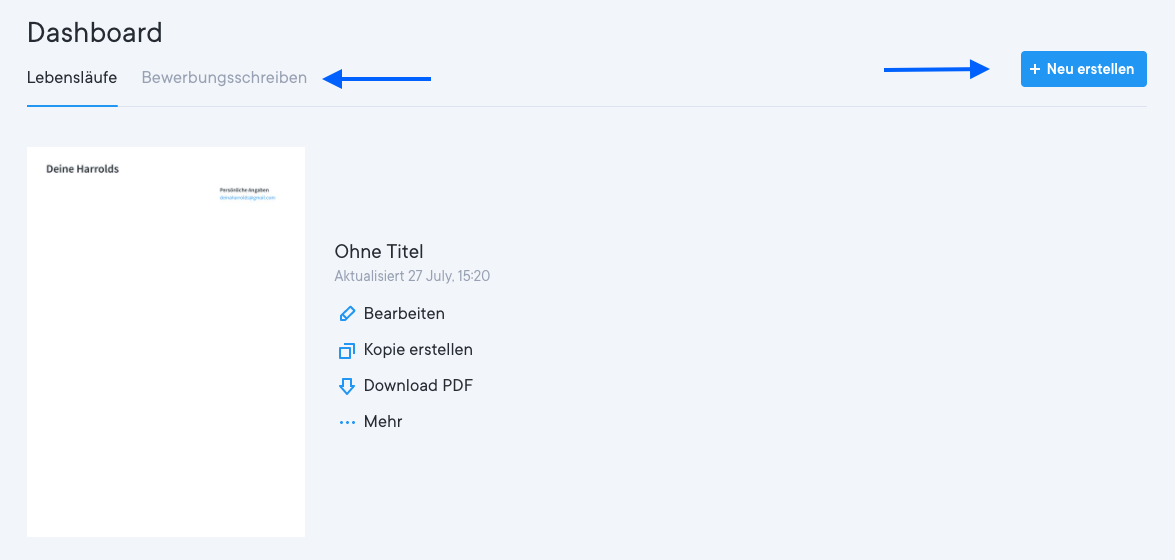 Hast du deinen Lebenslauf einmal dupliziert und neu benannt, kannst du damit beginnen, die neue Version zu bearbeiten. Die Originalversion deines Lebenslaufs bleibt die gleiche.