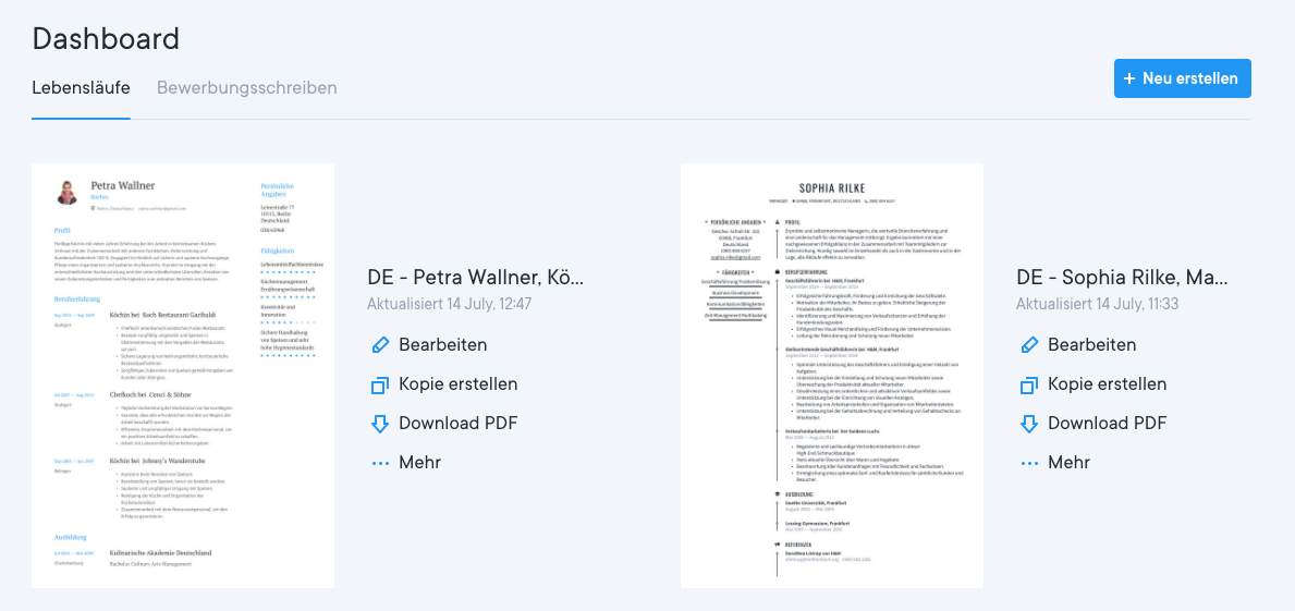 Du kannst mit dem Premium-Abonnement unbegrenzt viele Versionen deines Lebenslaufs erstellen. Mit dem kostenlosen Abonnement kannst du jeweils einen Lebenslauf und ein Bewerbungsschreiben verfassen, die du jedoch fortlaufend bearbeiten kannst.